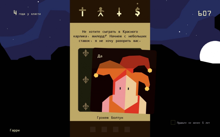 Историю вам придется создавать самим. Все ваше королевство имеет четыре основных составляющих, с которыми придется считать, это сам народ, армия, церковь и деньги. Как вы уже поняли, вам будут выпадать карточки с событиями, а вы решаете, что сделать в данной ситуации. Каждый вариант ответа влияет на одну из сторон королевства. Например, священник пишет вам предложение повысить налоги на церковь, а вам обязуется отдать долю. Не трудно понять, что в данной ситуации ущемляются обычные люди, за то отношения с церковью улучшаются, а казна растет. Иногда вам будет предложен сбор крестового похода на неверных с целью их скорейшего уничтожения. В таком случае ваш народ начнет потихоньку вымирать, нужно заботиться, чтобы в королевстве остались люди.
