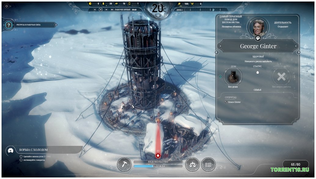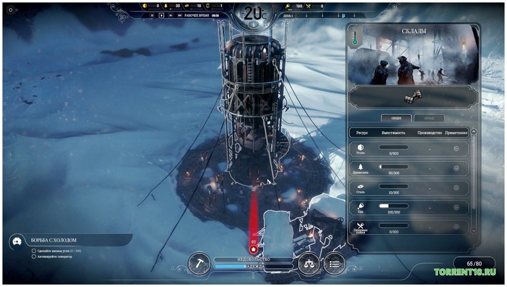 Занимайтесь непрерывной добычей пропитания в Frostpunk от Механиков и для этого, как это не прискорбно необходимо посылать разведчиков за пределы территории сохраняющего тепло, скачайте через торрент, чтобы осуществить задуманное. Помимо этого, в их обязанности будет входить добыча доступных вещей и выгодных ресурсов, что не может не отразиться на качестве чьей-то жизни. Такие перед вами будут стоять трудности, но если вы приложите достаточно усилий, то сможете их преодолеть. Данная работа феноменальна и понравиться многих геймерам. На его прохождение вы потратите много часов, однако они запомнятся вам на долго и будут незабываемы. Здесь вам необходимо проявить лидерские качества, ведь люди рассчитывают на вашу помощь, а также будьте бдительны и принимайте сложные моральные решения. Как только отыщите тепло, стройте вокруг него город и создавайте нормальные условия для проживания. Он выглядит, как генератор и от него исходит тепло. И уже потом, как только достигните нормальных результатов пользуйтесь благами вновь построенной цивилизации. Это видеоигра подойдет смелым и решительным или тем, кто хочет таковым стать.